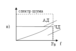 в) Спектр шумов после амплитудного (АД) и частотного (ЧД) детекторов