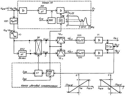 В декодирующем устройстве условно можно выделить три части: канал сигнала яркости, собственно канал цветности и канал цветовой синхронизации.