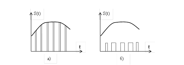 В сущности, любой дискретный или цифровой сигнал является сигналом аналоговым. Так, медленно изменяющемуся во времени аналоговому сигналу Ya(t) можно сопоставить его дискретный образ, имеющий вид последовательности прямоугольных видеоимпульсов одинаковой длительности; высота этих импульсов пропорциональна значению S(t) в отсчетных точках (а). Такой процесс превращения аналогового сигнала в дискретный называется дискретизацией по уровню (рисунок 2.3а). Дискретизация при изменении длительности отсчетных импульсов, при которой сохраняется высота отсчетных импульсов, но изменяется их длительность в соответствии с текущими отсчетными значениями, называется дискретизацией по времени (рисунок 2.3б).