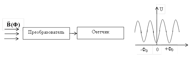 Сверхпроводниковый ИП представляет собой сверхпроводящее кольцо с одним или двумя джозефсоновскими переходами. Такая конструкция получила название сверхпроводящего квантового интерферометра (СКВИД). Он преобразует изменения магнитного потока или магнитной индукции в количество периодических изменений напряжения, снимаемого с преобразователя. Структурная схема прибора для измерения магнитного потока представлена на Рисунке 2.13.