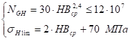 Предел выносливости зубьев при изгибе  σFlim соответствует базовому числу циклов напряжений NGF и зависит от химико-термической обработки материала и технологии изготовления. Например, для термообработки улучшение σFlim = 1,75НВср, где НВср – средняя твёрдость сердцевины зубьев.