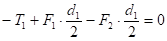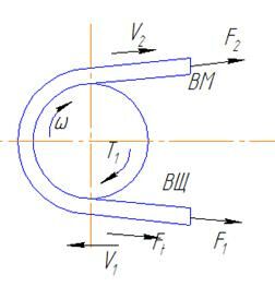 При приложении вращающего момента  , происходит перераспределение сил натяжения ремня ВЩ ветвь дополнительно натягивается до силы  , а ВМ – уменьшается  до  . Из условия равновесия моментов относительно оси вращения: