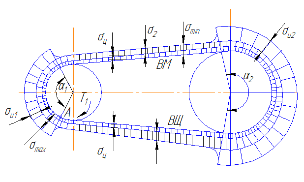 При работе ременной передачи напряжения в ремне распределены неравномерно.