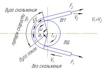 Упругое скольжение происходит не на всей дуге обхвата  , а лишь не ее части – дуге скольжения  , которая расположена со стороны сбегания ремня со шкива.