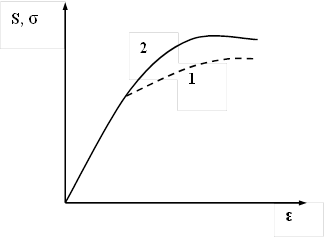 Отсюда видно, что при сжатии, в противоположность растяжению, S<σ, так как F>F0. Диаграммы истинных напряжений обычно строят в координатах S-ε (рисунок 22, кривая 1), хотя в качестве меры деформации можно использовать истинное относительное сжатие: