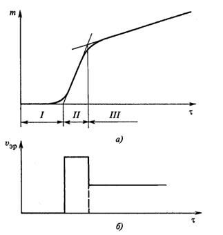 Эрозия материала обычно измеряется массой металла т, унесенного с единицы поверхности за время τ. В качестве аргумента могут использоваться и другие величины, пропорциональные времени: количество капель жидкости, вступившей в соударе­ние с поверхностью ко времени х и т.д. Если эрозия протекает при неизменных внешних условиях (диа­метр капель dк и скорость соударения wк с поверхностью постоянны, постоянен угол встречи с по­верхностью, плотность жидкости и т.д.), то можно получить кривую эрозии, показанную на рис. 1.31.