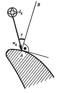 Таким образом, рассмотрение процесса воздей­ствия капли на поверхность рабочей лопатки пока­зывает следующее. Если зафиксировать на спине рабочей лопатки некоторую точку А (рис. 1.34), то в эту точку (а лучше сказать в окружность неко­торого малого радиуса) попадают капли и реализуется так называемый дискретный случайный про­цесс. В этом процессе, как сам факт столкновения капли с поверхностью, так и диаметр капли dк, ее скорость wк, и угол γ между вектором скорости wк и нормалью АВ к поверхности являются случайны­ми величинами.