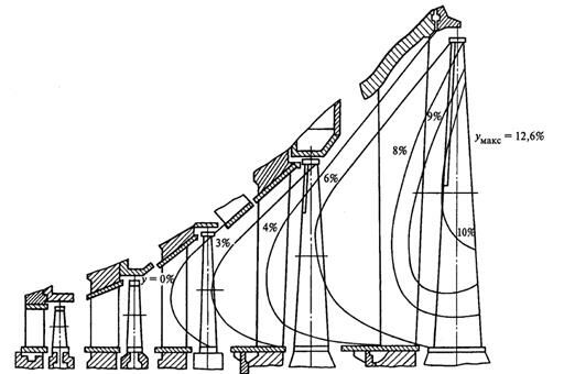 В табл. 1.2 приведены осредненные данные по эрозионному износу рабочих лопаток по­следних ступеней на шести–семи турбинах разного типа за 6–8 лет эксплуатации. Видно, что даже по­сле этого небольшого срока эксплуатации износ со­ставляет десятки миллиметров, и на периферии он может достигать 30 % от хорды профиля.