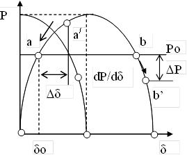 Точка «а» – установившейся режим. Покажем это: dа +Dd, DP/Dd > 0 – положительное значение синхронизирующей мощности (dP/dd) обеспечивает статическую устойчивость ЭС.