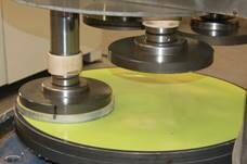 Шлифовка связанным абразивом выполняется на станках с эксцентрично расположенными осями вращения шлифовальника и обрабатываемых пластин. Главной особенностью этого процесса является конструкция шлифовального круга, который представляет собой металлический диск с закрепленными на его поверхности абразивными вставками.