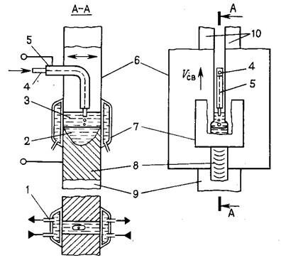 При электрошлаковой сварке основной и электродный металлы расплавляются теплотой, выделяющейся при прохождении электрического тока через шлаковую ванну. Процесс электрошлаковой сварки начинается с образования шлаковой ванны 3 в пространстве между кромками основного металла 6 и формирующими устройствами (ползунами) 7, охлаждаемыми водой, подаваемой по трубам 1, путем расплавления флюса электрической дугой, возбуждаемой между сварочной проволокой 4 и вводной планкой 9. После накопления определенного количества жидкого шлака дуга шунтируется шлаком и гаснет, а подача проволоки и подвод тока продолжаются. При прохождении тока через расплавленный шлак, являющийся электропроводящим электролитом, в нем выделяется теплота, достаточная для поддержания высокой температуры шлака (до 2000° С) и расплавления кромок основного металла и электродной проволоки. Проволока вводится в зазор и подается в шлаковую ванну с помощью мундштука 5. Проволока служит для подвода тока и пополнения сварочной ванны 2 расплавленным металлом. Как правило, электрошлаковую сварку выполняют при вертикаль ном положении свариваемых заготовок. По мере заполнения зазора между ними мундштук для подачи проволоки и формирующие ползуны передвигаются в вертикальном направлении, оставляя после себя затвердевший сварной шов 8.