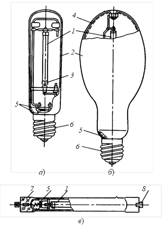 а) – в прозрачной колбе (типа ДНаТ); б) – в светорассеивающей колбе (типа ДНаТМт); в) – в софитном исполнении (типа ДНаТСф); 1 –разрядная трубка; 2 – стеклянная внешняя колба;