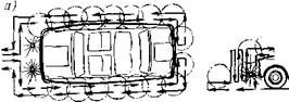Механизированную мойку автомобиля осуществляют с по­мощью специальных установок с большим числом направленных струй воды (или моющего раствора), содержащей механи­ческие примеси для удаления грязи, а также вращающихся цилиндрических щеток и других устройств. По принципу дей­ствия механизированные моечные установки для легковых авто­мобилей подразделяют на струйные, со щеточными барабанами и струйно-щеточные. В зависимости от способа относительного пере­мещения автомобиля и моечных средств различают механизи­рованные моечные установки с перемещением автомобиля отно­сительно щеток и с перемещением каретки со щетками вокруг неподвижно стоящего автомобиля. Действующие установки имеют 1—7 щеток (рис. 3.8,а).