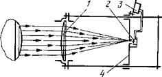 Рис. 6.9. Прибор для проверки фар: а — общий вид: 1 — оптическая камера; 2 — прямоугольная призма; 3 — поворот­ная ось; б — схема оптической камеры прибора: 1 — линза; 2 — фотоэлемент; 3 — миллиамперметр; 4 — экран