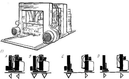 Установка выполняет операции мойки и сушки автомобиля за рабочий цикл (состоящий из хода вперед и хода назад) в течение 10—12 мин. Последовательность этого процесса следую­щая. При ходе вперед (поз. А и В, рис. 6.2,6) моечная и сушильная установки электрически соединены между собой и перемещаются одна за другой. Вентиляторы сушильной установ­ки при этом не работают. Моечная установка осуществляет предварительную мойку автомобиля с применением моющих средств. В конце хода вперед моечная и сушильная установки останавливаются одновременно (поз. В).