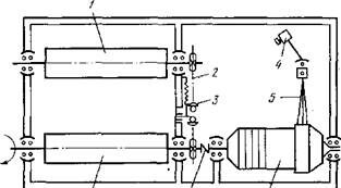/ — ролики; 2 — цепная передача; 3 — на­тяжное устройство; 4 — датчик измерения усилия; 5 — рычаг; 6 — мотор-редуктор; 7 — муфта