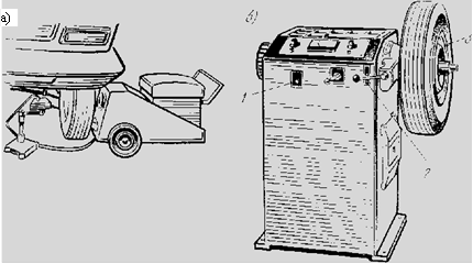 Для динамической балансировки колес без снятия с автомо­биля применяют электронные станки (рис. 4.12). Время балансировки 30 с. Порядок работы станка следующий: при вращении колеса (с помощью узла для раскручивания колеса) колебания подвески, вызываемые дисбалансом, воспринимаются индукционным датчиком, укрепленным на одной из деталей подвески, и преобразуются в электрические сигналы, пропорциональные амплитуде колебаний. При достижении максималь­ного значения дисбаланса включается стробоскоп, который осве­щает балансируемое колесо. Оператор визуально определяет точку на шине колеса, соответствующую месту дисбаланса, а стрелка измерительного прибора показывает его величину.