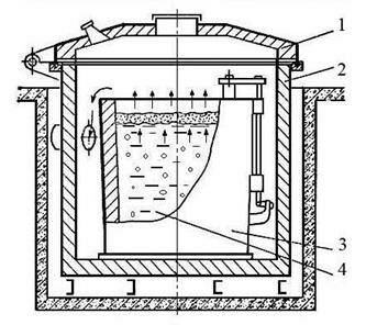 Вакуумирование в ковше выполняют в стальных, футерованных изнутри камерах. Ковш 3 с жидкой сталью 4 помещается в камеру 2, закрывающуюся герметичной крышкой 1. Вакуумными насосами в камере создается разрежение до остаточного давления 267…667 Н/м2 (0,267…0,667 кПа). Продолжительность вакуумироваиия 12…15 мин. При понижении давления из жидкой стали выделяются водород и азот, а при большой окисленности металла уменьшается и содержание кислорода вследствие его взаимодействия с углеродом стали. Всплывающие пузырьки газа захватывают неметаллические включения, в результате чего содержание их в стали снижается. При снижении содержания газов и неметаллических включений улучшаются прочностные и пластические характеристики стали.