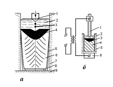 Электрошлаковый переплав. Способ разработан в Институте электросварки им. Е. О. Патона для переплава стали с целью повышения качества металла. Электрошлаковому переплаву подвергают выплавленный в электродуговой печи и прокатанный на круглые прутки металл. Источником тепла при ЭШП явялется шлаковая ванна, нагреваемая за счет прохождения через нее электрического тока. Электрический ток подводится к переплавляемому электроду 1, погруженному в шлаковую ванн 2, и к поддону 9, установленному внизу в водоохлаждаемой металлической изложнице (кристаллизаторе) 7, в которой находится затравка 8 (рис. 1.18). Выделяющаяся теплота нагревает шлаковую ванну 2 до 1700 °С и более и вызывает оплавление конца электрода. Капли жидкого металла 3 проходят через шлак, собираются, образуя под шлаковым слоем металлическую ванн 4.