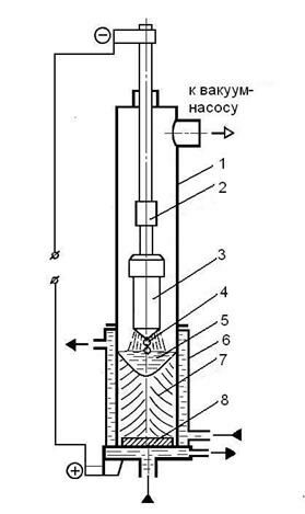 В зависимости от требований, предъявляемых к металлу, расходуемый электрод может быть получен механической обработкой слитка, выплавленного в электропечах. Расходуемый электрод 3 закрепляют на водоохлаждаемом штоке 2 и помещают в корпус 1 печи и далее в медную водоохлаждаемую изложницу 6. Из корпуса печи вакуум-насосами откачивают воздух до остаточного давления 1,33 Н/м2 (0,00133 кПа). При подаче напряжения между расходуемым электродом-катодом и затравкой-анодом 8, помещенной на дно изложницы, возникает дуговой разряд. Теплотой, выделяющейся в зоне разряда, расплавляется конец электрода; капли 4 жидкого металла, проходя зону дугового разряда, дегазируются, постепенно заполняют изложницу и затвердевают, образуя слиток 7.Дуга горит между расходуемым электродом и ванной 5 жидкого металла, находящейся в верхней части слитка, на протяжении всей плавки. Благодаря сильному охлаждению нижней части слитка и разогреву дугой ванны жидкого металла в верхней его части создаются условия для направленного затвердевания слитка. В результате направленного затвердевания неметаллические включения сосредоточиваются в верхней части слитка, а усадочная раковина в слитке мала. Слитки, полученные в вакуумных дуговых печах, содержат очень небольшое количество газов, неметаллических включений, отличаются высокой равномерностью химического состава, имеют хорошую макроструктуру. Поэтому металл, полученный ВДП, отличается повышенными механическими свойствами и пластичностью. Из слитков ВДП изготовляют ответственные детали турбин, двигателей, авиационных конструкций. Емкость дуговых вакуумных печей — до 50 т.