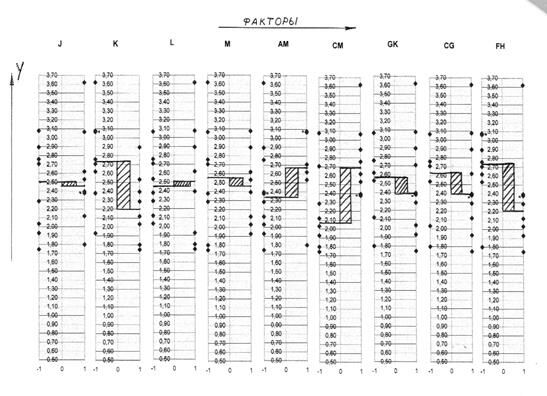 При исследовании сложных процессов экспериментатор имеет дело с большим количеством факторов. Для первоначального исследования бывает желательно оставить факторы, оказывающие наиболее существенное влияние на функцию отклика. В этом случае эксперименты проводят, используя насыщенные, либо сверхнасыщенные планы. Экспериментальный материал обрабатывается в несколько этапов с помощью диаграмм рассеивания. Суть метода заключается в следующем. По оси ординат диаграммы (рис. 4) откладываются экспериментальные значения функции отклика, а по оси абсцисс – учитываемые в эксперименте факторы. Поле рассеяния экспериментальных точе представляет собой две колонки точек, соответствующих верхнему и нижнему уровням варьирования фактора. При анализе диаграммы рассеяния для данного фактора мы отвлекаемся от действия других факторов. Если фактор влияет на выходной параметр, то при переходе его с одного уровня на другой произойдет смещение центра распределения.