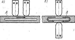 ИВ — излучающий вибратор; ПВ — приемный вибратор; Д — дефект