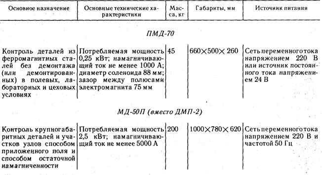 При контроле в условиях эксплуатации рекомендуется использовать передвижные МП-50П или переносные ПМД-70 дефектоскопы (табл. 2.9). Указанные дефектоскопы снабжены приставными электромагнитами для продольного намагничивания отдельных участков деталей.