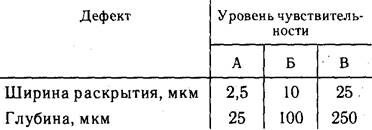 В практике магнитопорошкового контроля условно приняты следующие три уровня чувствительности (А, Б, В), позволяющие приближенно судить о размерах обнаруживаемых поверхностных дефектов, таких как трещины (табл. 2.10).