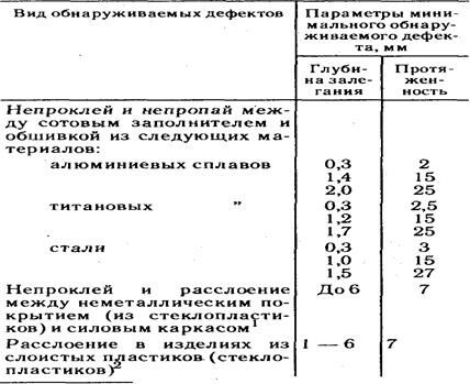 | Расслоение в деталях слоистых пластиков Непроклей и расслоение между неметаллическим покрытием и силовым каркасом, расслоение в покрытии | 0,5 25 40 0,5 — 25 | 15 40 20 15 — 40 | Дефекты выявляются на глубине не более 2/3 от общей толщины детали при одностороннем контроле Глубина залегания и протяженность минимального обнаруживаемого дефекта зависят от материала покрытия |