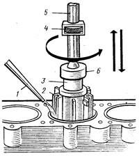 Доводку цилиндров выполняют на вертикально-хонинговальных или вертикально-сверлильных станках специальными хонинговальными головками 3 (рис. 4.5) с подачей охлаждающей жидкости 1 в зону трения. На головке по окружности установлены четыре, пять или шесть сменных мелкозернистых абразивных брусков 2. Головка, соединенная с хвостовиком 5 через шарнир 6, закрепляется в шпинделе станка. При хонинговании головка с абразивными брусками совершает вращательное и возвратно-поступательное движение по стенкам цилиндра (см. стрелки). На необходимый размер бруски разжимают вручную при помощи кольца подачи 4.
