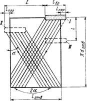 Рис. 4.6. Развертка сетки следов обработки при хонинговании цилиндров блока: L — ход хонинговальной головки; lотв — длина цилиндра; lбр — длина абразивного бруска хонинговальной головки; lпер — перебег абразивных брусков за края цилиндра; a — угол подъема следа; 2а — угол скрещивания следов; /, //, /// — последовательные положения бруска за один двойной ход