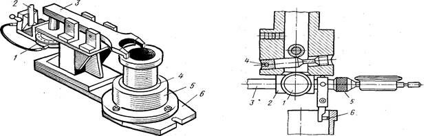Точность центровки проверяют при помощи индикаторного приспособления (центроискателя) (см. рис. 4.3), колодка 2 которого ввинчивается в торец резцовой головки шпинделя. Упор 6 рычага подводят к зеркалу цилиндра на глубине 3 — 4 мм, положение рычага 3 фиксируется винтом 1 и гайкой 5. Шкалу индикатора устанавливают на "О" и поворотом шпинделя на один оборот определяют погрешность центрирования. При необходимости корректируют положение детали.