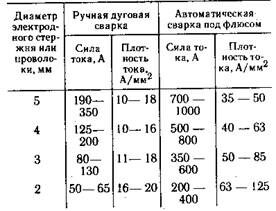 Таблица 7.2. Сила и плотность тока я электроде при ручной дуговой сварке и сварке под слоен флюса