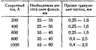 Таблица 7,3. Высота слоя флюса и грануляции частиц для сварки на различных режимах