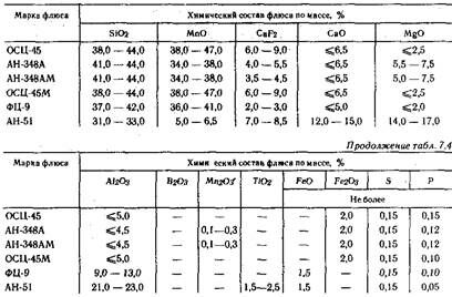Таблица 7.4. Некоторые флюсы, применяемые при сварке углеродистых и малолегированных сталей