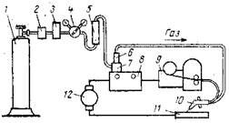 1 — баллон с углекислым газом; 2 — осушитель; 3 — подогреватель газа; 4 -- газовый редуктор; 5 — расходомер газе;6 — клапан; 7 — электромагнит; 8 — аппаратный ящик; 9 — механизм подачи проволоки; 10 — горелка; 11 — восстанавливаем а и деталь; 12 — источник тока