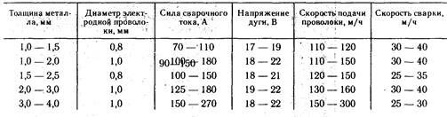 Таблица 7.9. Типовые режимы сварки в СО2 тонколистовой стали