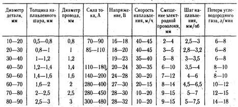Таблица 7.10. Режимы наплавки цилиндрических поверхностей в зависимости от диаметра детали и толщины наплавленного шара металла