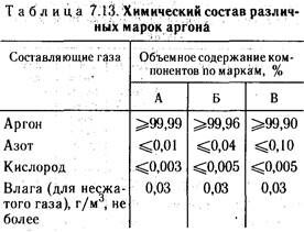 Инертный газ аргон получают из воздуха методом ректификации в специальных разделительных колон­ках. Полученный таким образом "сы­рой" аргон содержит значительное количество примесей, в частности кислорода. Дальнейшая его очистка осуществляется беспламенным сое­динением кислорода с добавляемым водородом в присутствии катализа­торов. В чистом аргоне в качестве примесей остается небольшое коли­чество азота, кислорода и влаги. В табл. 7.13 приведены составы различ­ных сортов аргона (А, Б, В), поставля­емых для сварки.