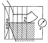 Более простым и совершенным является метод естественно образующейся термопары, предложенный Е. Гербертом и К. Готвейном. Метод основан на том, что в процессе резания (рис. 5) в месте соприкосновения передней поверхности инструмента со стружкой и задней поверхности с поверхностью резания естественным путем создаются термопары, электродами которых являются материал обрабатываемой детали и материал режущей части инструмента. Если обрабатываемую деталь и инструмент включить в замкнутую электрическую цепь, то величина термоэлектродвижущей силы, возникающей в термоэлементе, будет пропорциональна температуре скользящего «спая» образовавшейся термопары. Методом естественно образующейся термопары измеряют не максимальную, а некоторую среднюю контактную температуру на передней и задней поверхностях инструмента. Действительно, «спай» термопары можно представить как большое количество параллельно соединенных термопар (термоэлементов), имеющих различное внутреннее сопротивление R1, R2Rn. Различные точки площадок контакта нагреты неодинаково, а поэтому в каждом термоэлементе будет генерироваться различная термоэлектродвижущая сила e1, е2 ... еп. На основе принципа суперпозиции напряжение U гальванометра, включенного в цепь, для любого количества термоэлементов определяется выражением