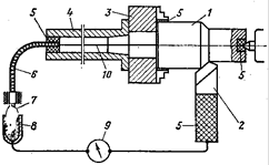 Схема измерения температуры при точении методом естественно образующейся термопары изображена на рис. 6. Обрабатываемая болванка 1 изолирована от патрона 3 и центра задней бабки эбонитовыми прокладками и пробкой 5. Цельный резец 2 из быстрорежущей стали или твердого сплава изолирован от резцедержателя эбонитовыми прокладками 5. Резец делают цельным для того, чтобы в месте приваривания или припаивания режущей пластинки к корпусу резца не образовались паразитные термопары. Болванка медным проводником 10 соединена с гибким валом 6, закрепленным в эбонитовой втулке, установленной на конце шпинделя станка 4. Контактный наконечник 7 гибкого вала опущен в ванночку со ртутью 8. Милливольтметр 9 одной клеммой соединен с торцом резца, а вторым - с ртутным токосъемником. Замкнутая электрическая цепь состоит из болванки - проводника - гибкого вала - токосъемника - милливольтметра - резца - болванки. Болванку изолируют от станка для устранения влияния паразитных термопар, могущих возникнуть между отдельными деталями станка. Однако роль паразитных термопар при высокой температуре контактных поверхностей инструмента незначительна, и за счет некоторого снижения точности измерения установку можно упростить, отказавшись от изоляции болванки, сохранив изоляцию только резца.