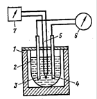 При первом способе тарировку производят в расплавленном металле (рис. 7). В электропечь 1 помещают тигель 2 с расплавленным металлом, имеющим низкую температуру плавления (свинцом, оловом, сурьмой, сплавом Вуда и г. п.). Стержни 3 и 4 из обрабатываемого и инструментального материалов опускают на одинаковую глубину в расплавленный металл, а к их концам присоединяют милливольтметр 6, применяемый в опытах по измерению температуры при резании. Между стержнями помещают контрольную термопару 5, гальванометр 7 которой проградуирован в градусах. Нагревая и охлаждая расплавленный металл, сравнивают показания милливольтметра 6 в милливольтах и гальванометра 7 в градусах и строят тарировочный график тv - °С.
