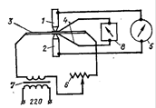 Достоинством метода естественно образующейся термопары является то, что его легко осуществить не только при точении, но и при сверлении, нарезании резьбы метчиком, строгании, фрезеровании, протягивании и других видах работ. Для перевода показаний милливольтметра в градусы Цельсия естественно образующаяся термопара должна быть предварительно подвергнута специальной тарировке. Схемы двух способов тарировки термопары приведены на рис. 7 и 8.
