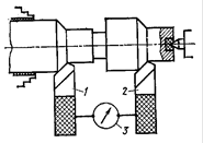При этом методе точение производят двумя одинаковыми по размерам и геометрическим параметрам резцами 1 и 2 (рис. 9), изготовленными из твердого сплава и быстрорежущей стали и подключенными к клеммам милливольтметра 3. Термоэлектродвижущая сила, возникающая вследствие отличия термоэлектрических свойств инструментальных материалов резцов, по закону аддитивности не зависит от рода обрабатываемого материала болванки, который в этом случае выполняет функцию только электрического проводника. Электродами естественно образующейся термопары являются мате­риалы резцов; величина электродвижущей силы зависит от их свойств и температуры нагрева контактных поверхностей резцов. Тарировку термопары производят только один раз. По точности метод уступает однорезцовому, так как предполагает строго одинаковые температуры контактных поверхностей обоих резцов". Однако вследствие различных коэффициентов трения на передней и задней поверхностях резцов и теплопроводности инструментальных материалов температуры на контактных поверхностях резцов не могут быть одинаковыми.