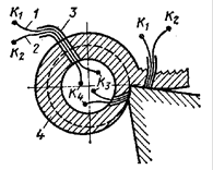 Так называемые «бегущие» термопары (рис. 10) применяют для изучения закона распределения температур на контактных поверхностях инструмента. Деталь 4 выполняют в виде винтового гребня прямоугольного профиля. В ней сверлят отверстие диаметром 0,5 - 0,7 мм, в которое вставляют электроды 1 и 2 термопары в защитной трубке 3 из материала детали. Электродами термопары служат проволочки диаметром 0,1 мм из меди и константана, изолированные эмалью. Концы термопар K1, К2, К3 и К4 через передающую систему подключены к осциллографу. При перерезании резцом защитной трубки и термопары электроды замыкаются на контактной поверхности стружки и поверхности резания. Часть электродов, двигаясь со скоростью стружки, через контакты К1 и К2 фиксирует на пленке осциллографа температуры по ширине площадки контакта стружки с резцом. Другая часть электродов, перемещаясь со скоростью, равной скорости резания, через контакты К3 и К4 фиксирует температуры по ширине площадки контакта поверхности резания с резцом.