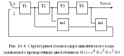 В качестве примера на рис.10.4 показана схема кодера циклического кода (7, 4), задаваемого проверочным многочленом
