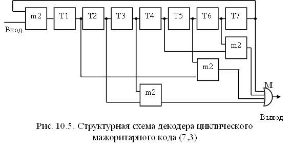 Схема декодера (рис.10.5) состоит из сдвигающего регистра, сумматоров по модулю 2 и мажоритарного элемента М. Простота ее обусловлена тем, что в данном случае каждый символ кодовой комбинации участвует в одном проверочном соотношении. Код, для которого выполняется это условие, называется кодом с разделенными проверками.
