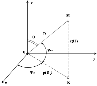 Сферическими координатами объекта наблюдения (точка М на рис.5.1) будут: D – радиус – вектор (дальность), jаз – долгота (азимут), jум – угол места, дополняющий полярное расстояние q до 900 (jум = 900 - q). В цилиндрической системе положение объекта определяется аппликатой z (высота Н) и полярными координатами jаз и r (горизонтальная дальность Dг) проекции точки М на плоскость хОy.