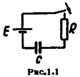 Пусть в момент t=0 цепь, состоящая из последовательно соединенных активного сопротивления R и не заряженной емкости C, подключается к источнику постоянного напряжения E (рис.1.1). Наличие переходного процесса в данной цепи связано с тем, что при весьма кратковременном ("мгновенном") изменении внешнего воздействия энергия поля конденсатора не может измениться мгновенно. Действительно, при скачкообразном изменении запаса энергии в цепи мощность, потребляемая цепью, принимала бы бесконечно большое значение, что не имеет физического смысла. Энергия электрического поля емкости