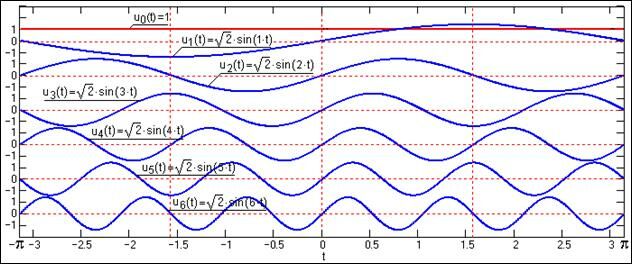 При распространении данных положений на функциональное пространство L2[a, b] в качестве координатного базиса пространства мы должны использовать совокупность функций {u0(t), u1(t), u2(t), …}, в пределе - бесконечную, которая должна быть системой ортогональных функций {uk(t), k=0, 1, 2, …}, т.е. все функции на этом отрезке должны быть взаимно ортогональны: